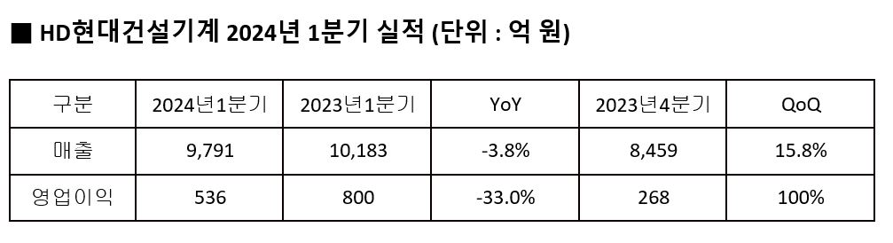HD현대 건설기계 부문 계열사인 HD현대건설기계(대표 최철곤)가 24일(수) 공시를 통해 2024년 1분기 매출 9,791억 원, 영업이익 536억 원을 기록했다고 밝혔다.