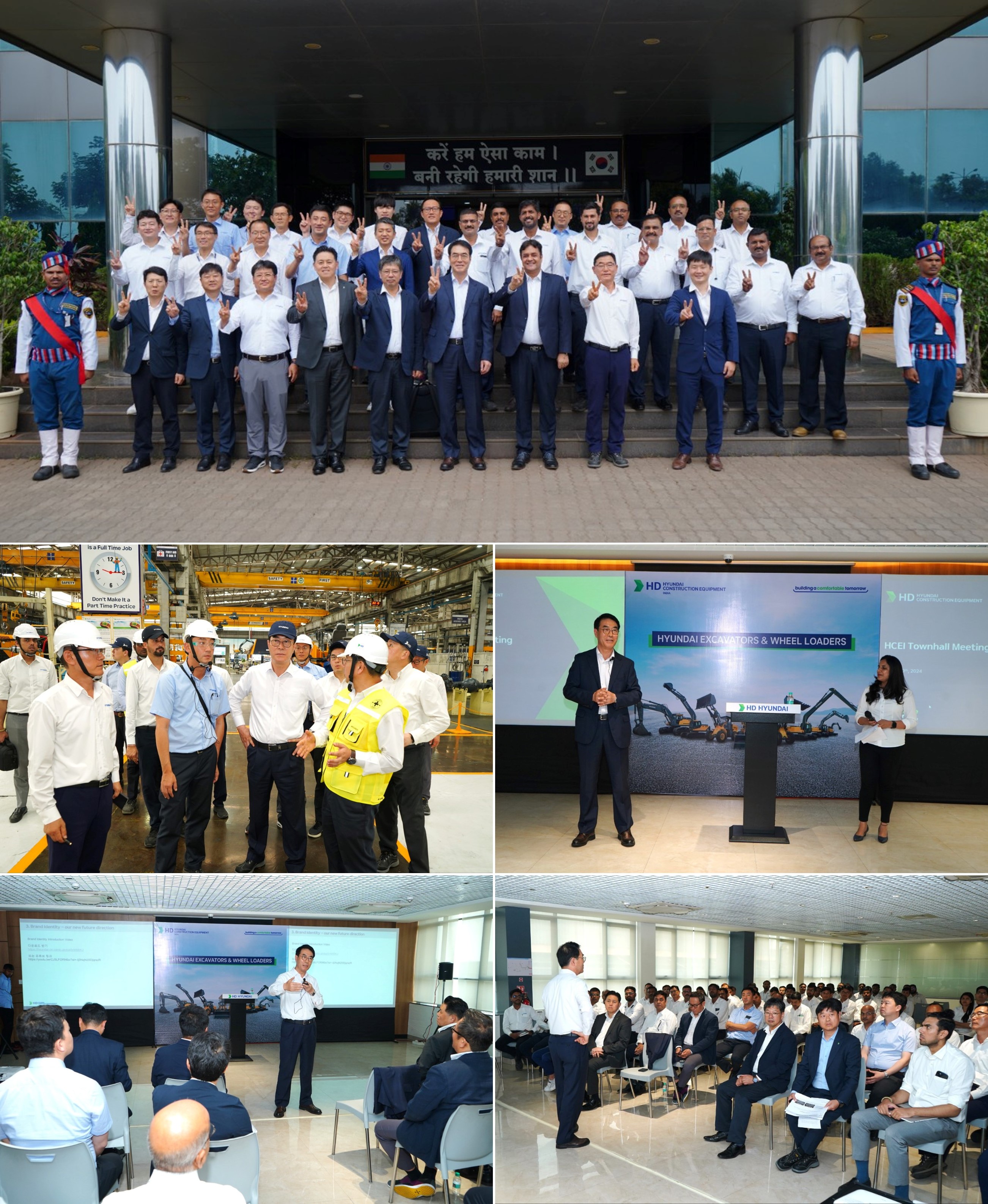 HD현대건설기계 최철곤 사장이 지난 5월 10일 송희준 전무(영업부문)를 비롯한 실무진과 함께 인도법인에서 타운홀 미팅을 진행했다. 이번 행사는 인도법인 직원들과 직접 소통하고 회사의 비전을 공유하기 위해 마련됐으며, 현지인 리더와 직원 90여 명이 참석했다.