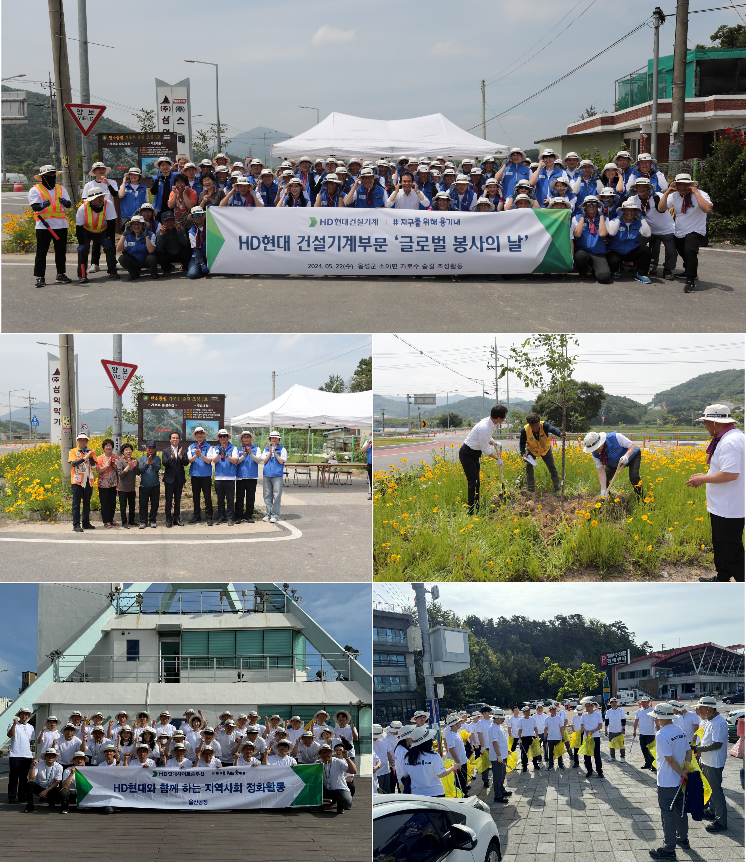 △ HD현대건설기계 음성 및 울산 사업장 임직원들이 음성 숲길 조성 및 울산 환경정화 봉사에 참여하는 모습