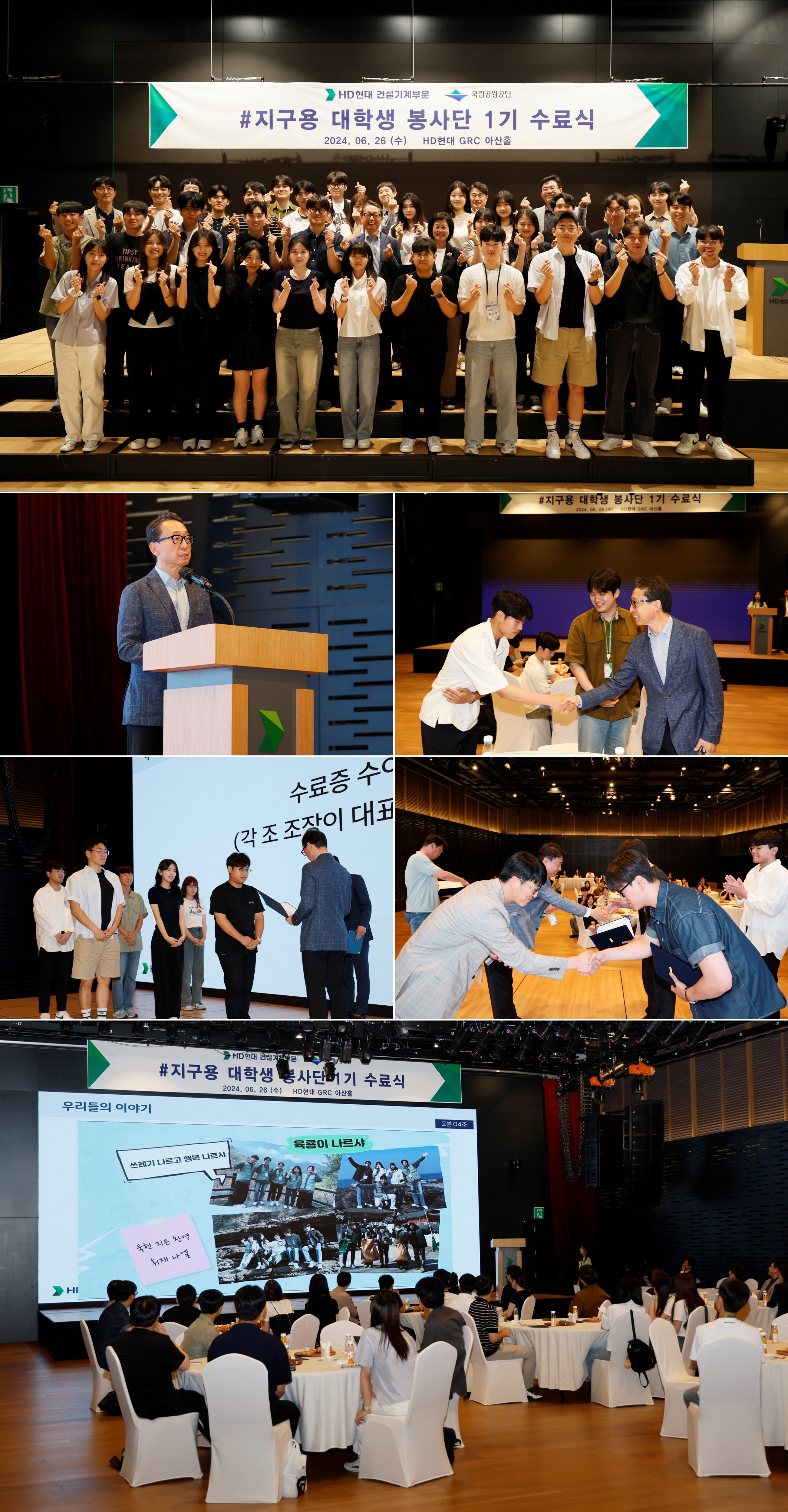 HD현대 건설기계 부문이 지난 6월 26일 HD현대 GRC 아산홀에서 ‘지구용 대학생 봉사단’ 1기 활동 수료식을 개최했다. 수료식에는 조영철 사장, 국립공원공단 손영임 자원보전이사와 봉사단원 등 총 27명이 참석했다.