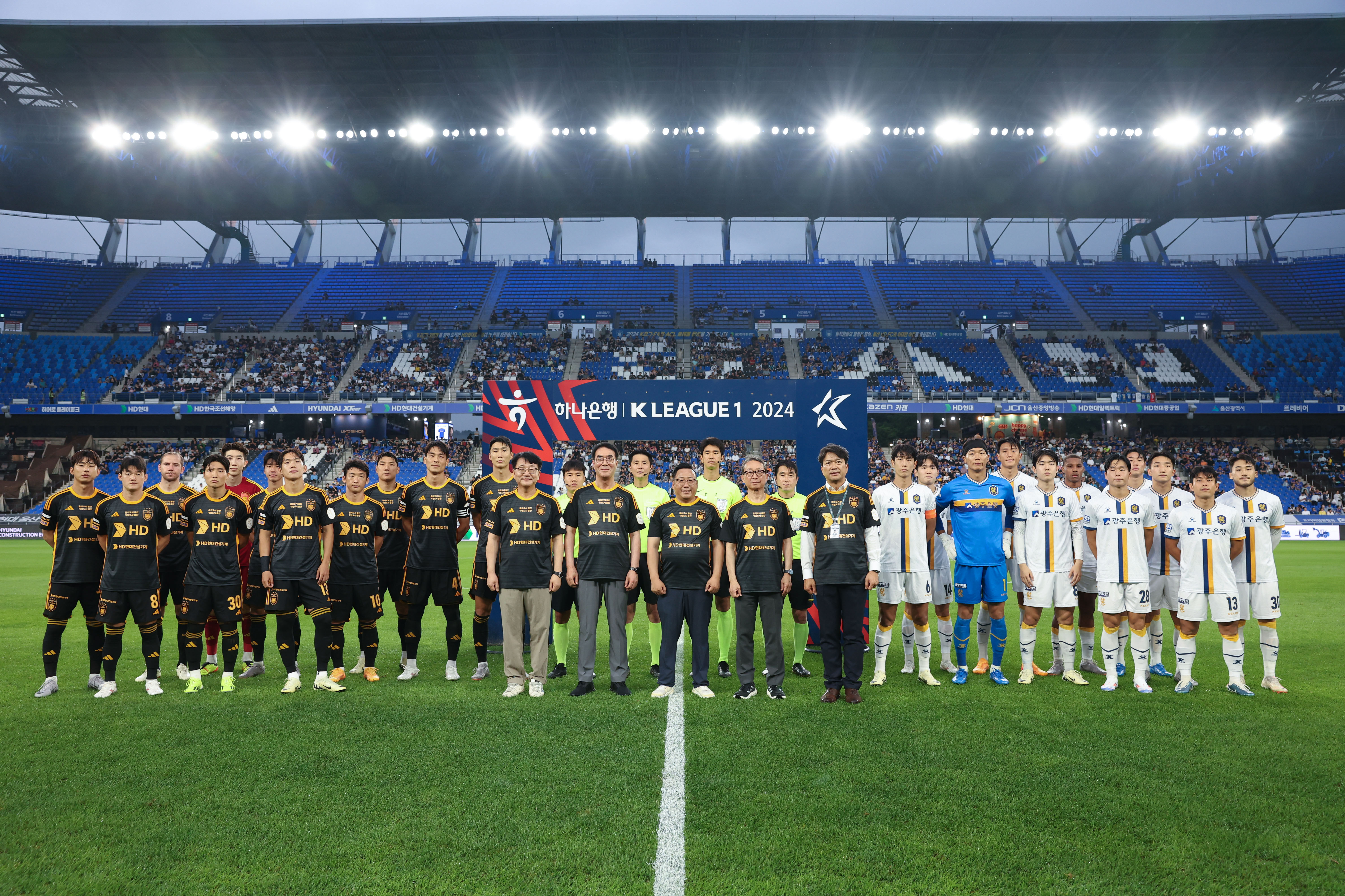 △ 'HD현대건설기계 브랜드 데이'로 치뤄진 울산 HD VS 광주 FC 경기에서 선수단과 HD현대 및 구단 관계자들이 기념사진을 촬영하고 있다. (앞줄 왼쪽부터 HD현대중공업 노진율 사장, HD현대건설기계 최철곤 사장, 채영석 명예이사, HD현대사이트솔루션 조영철 사장, 울산HD 김광국 단장)