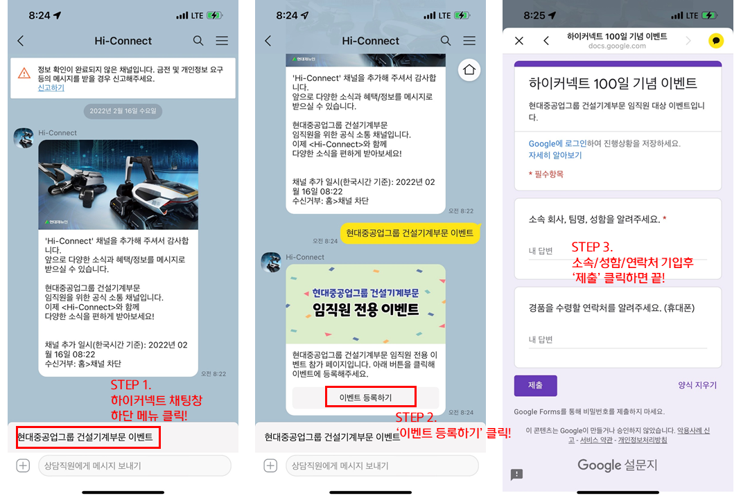 이벤트 참여를 위해서는 먼저 카카오톡 채널에서 ‘하이커넥트’를 추가한 후, 아래 가이드라인에 따라 소속, 성함, 연락처를 제출해야 합니다. 기존에 이미 하이커넥트를 추가한 임직원들도 설문지를 제출해야 이벤트에 응모 완료됩니다.