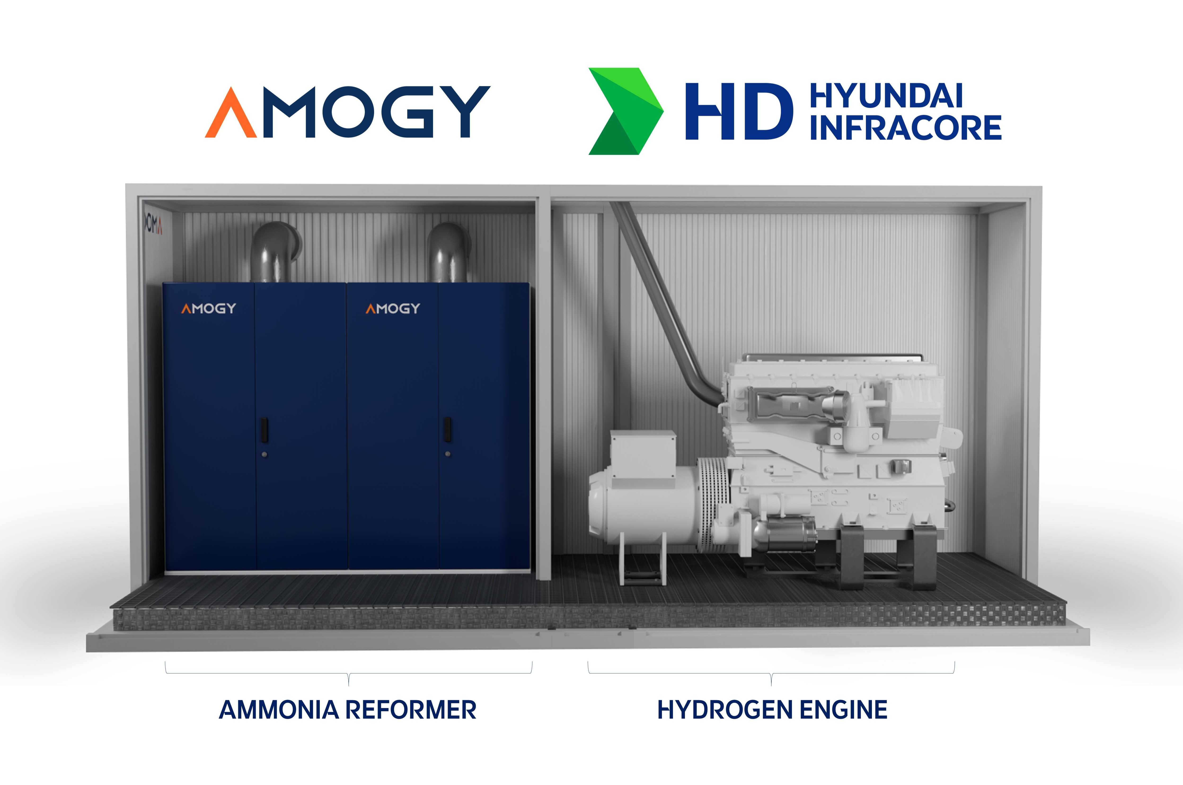 HD현대인프라코어는 22리터급 발전용 수소전소엔진 개발에 나서며, 아모지는 청정수소를 생산하기 위해 암모니아를 분해하는 장비인 ‘암모니아 크래커’를 개발해 각 사의 제품을 결합한다.