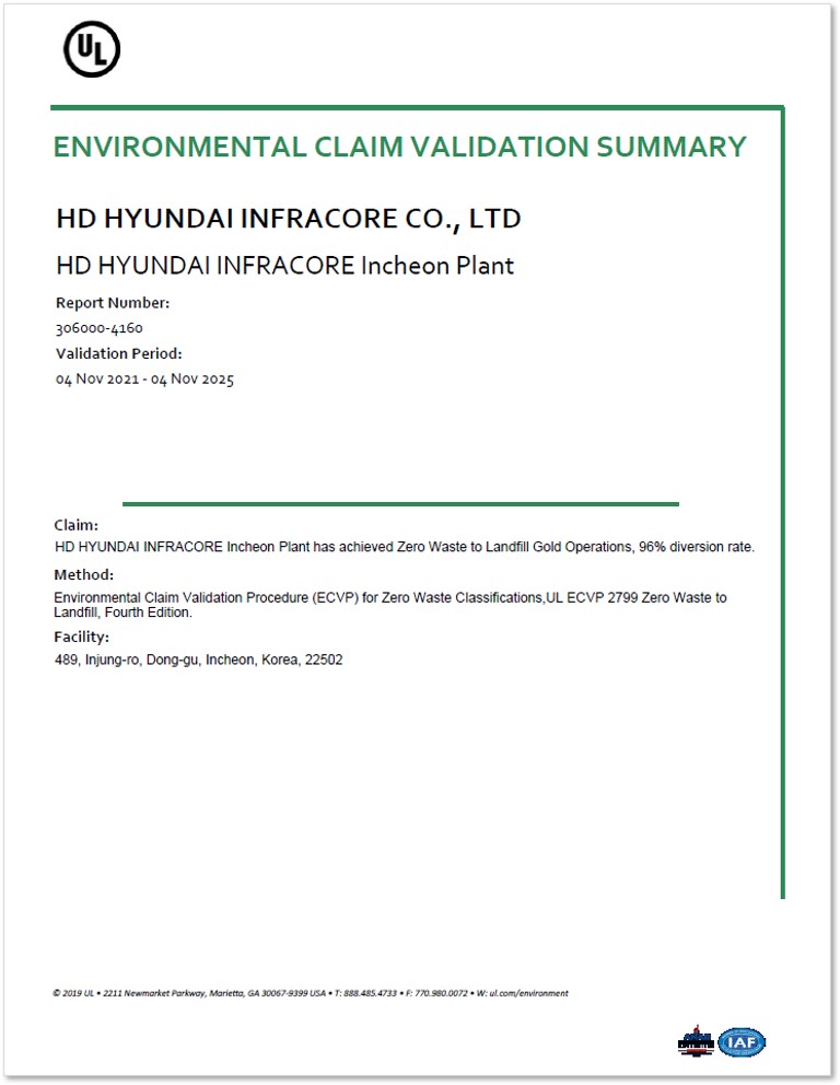 HD현대인프라코어가 지난 10월 31일 4년 연속으로 국제 자원순환 인증인 폐기물 매립 제로화(ZWTL, Zero Waste To Landfill) 골드 등급을 갱신했다.