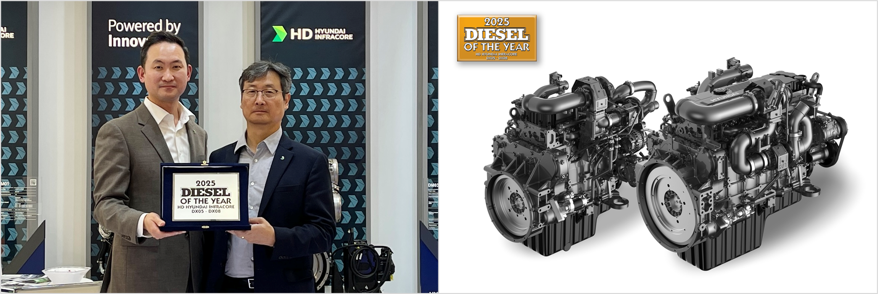 HD현대인프라코어는 차세대 디젤엔진 2개 모델(모델명: DX05, DX08)이 산업용 엔진 분야에서 최고 권위상으로 꼽히는 ‘올해의 디젤엔진 어워즈(2025 DIESEL OF THE YEAR AWARDS, 이하 DOTY)’를 수상했다고 10일(일) 밝혔다.