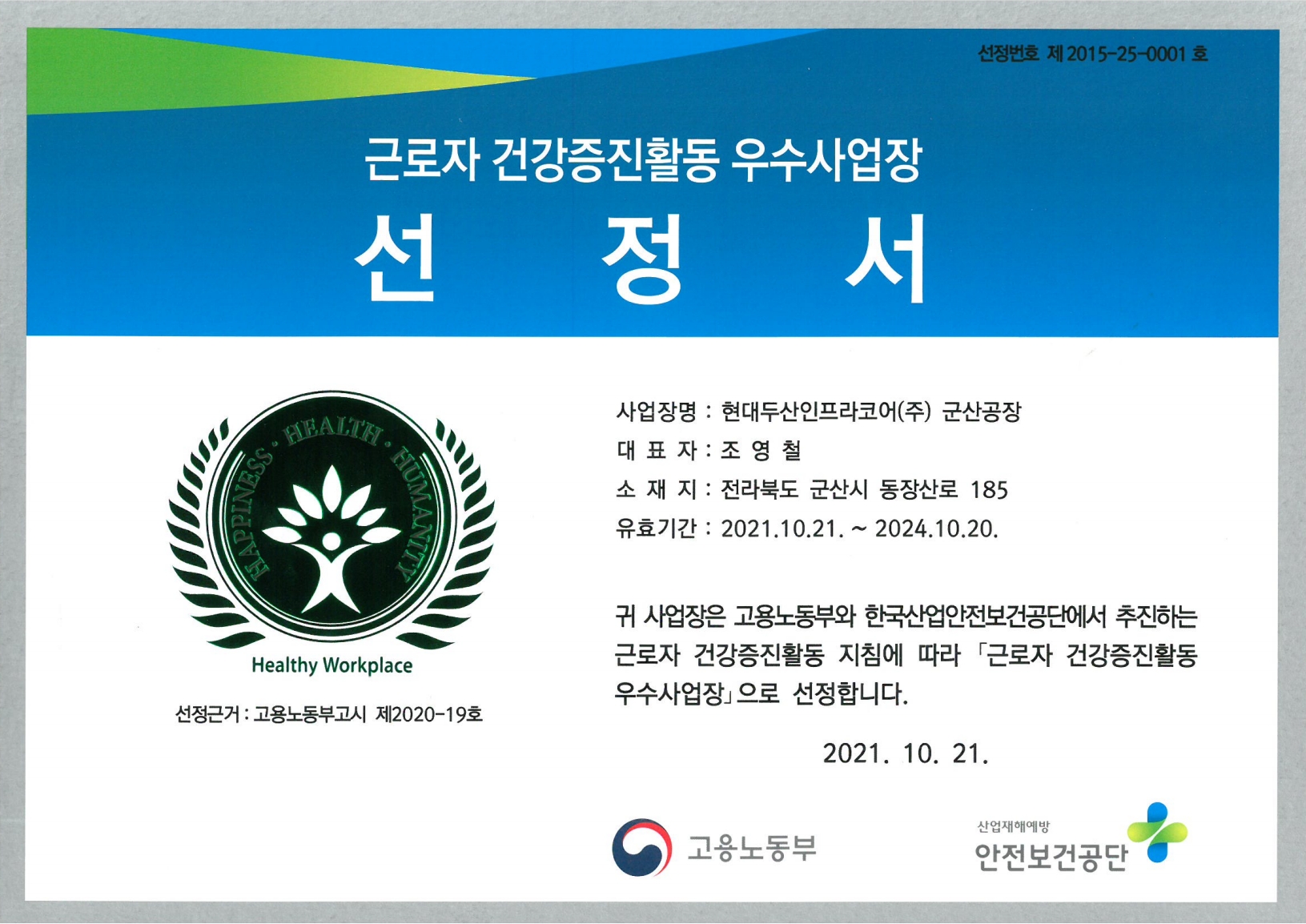 현대두산인프라코어 군산공장이 안전보건공단이 주관하고 고용노동부가 후원하는 ‘근로자 건강증진활동 우수사업장’으로 3년 연속 선정되었다. 우수사업장으로 선정된 군산공장은 향후 3년간 고용노동부 보건분야 감독을 유예 받게 된다.