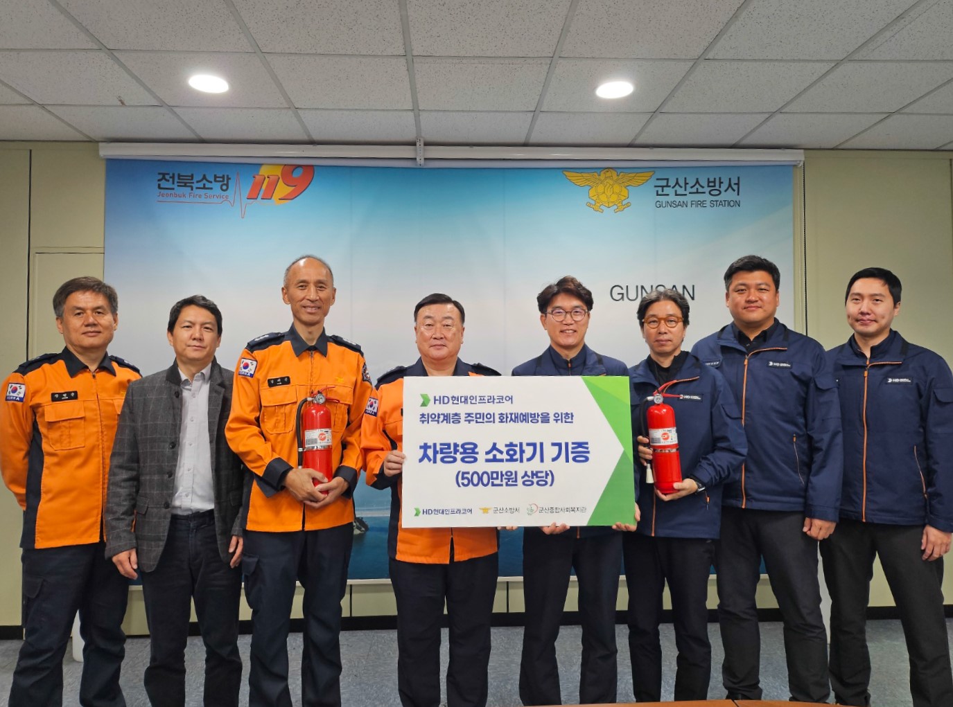 HD현대인프라코어가 11월 21일 군산소방서에 화재 취약 계층의 안전을 위해 500만원 상당의 차량용 소화기를 기증했다.