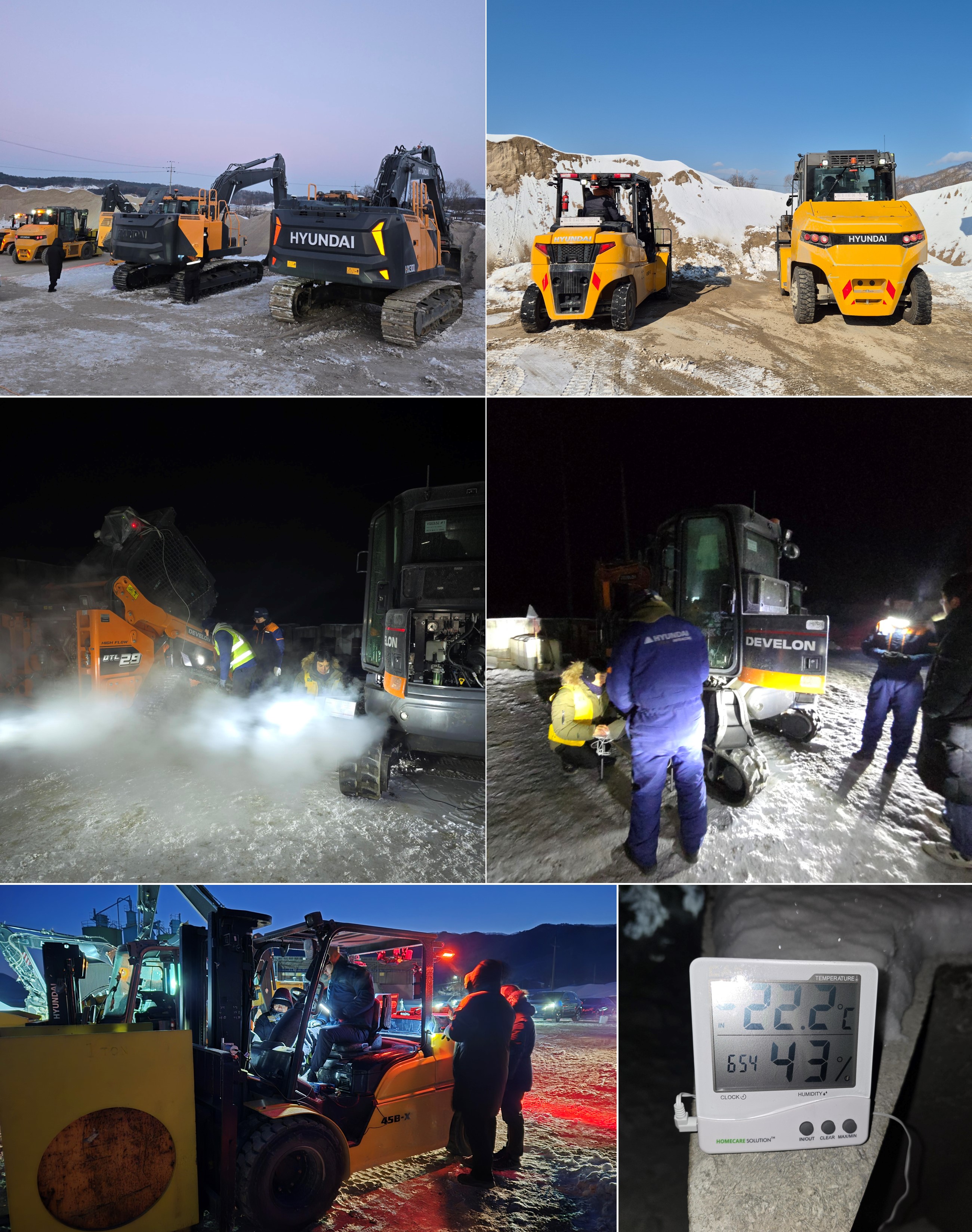 HD현대 건설기계 3사가 1월 7일부터 10일까지 강원도 철원에서 합동 혹한지 테스트를 실시했다. 혹한지 테스트는 저온의 극한 환경에서 건설기계 및 산업차량의 부품과 시스템이 제대로 구동되는지 성능을 확인하기 위해 진행된다.