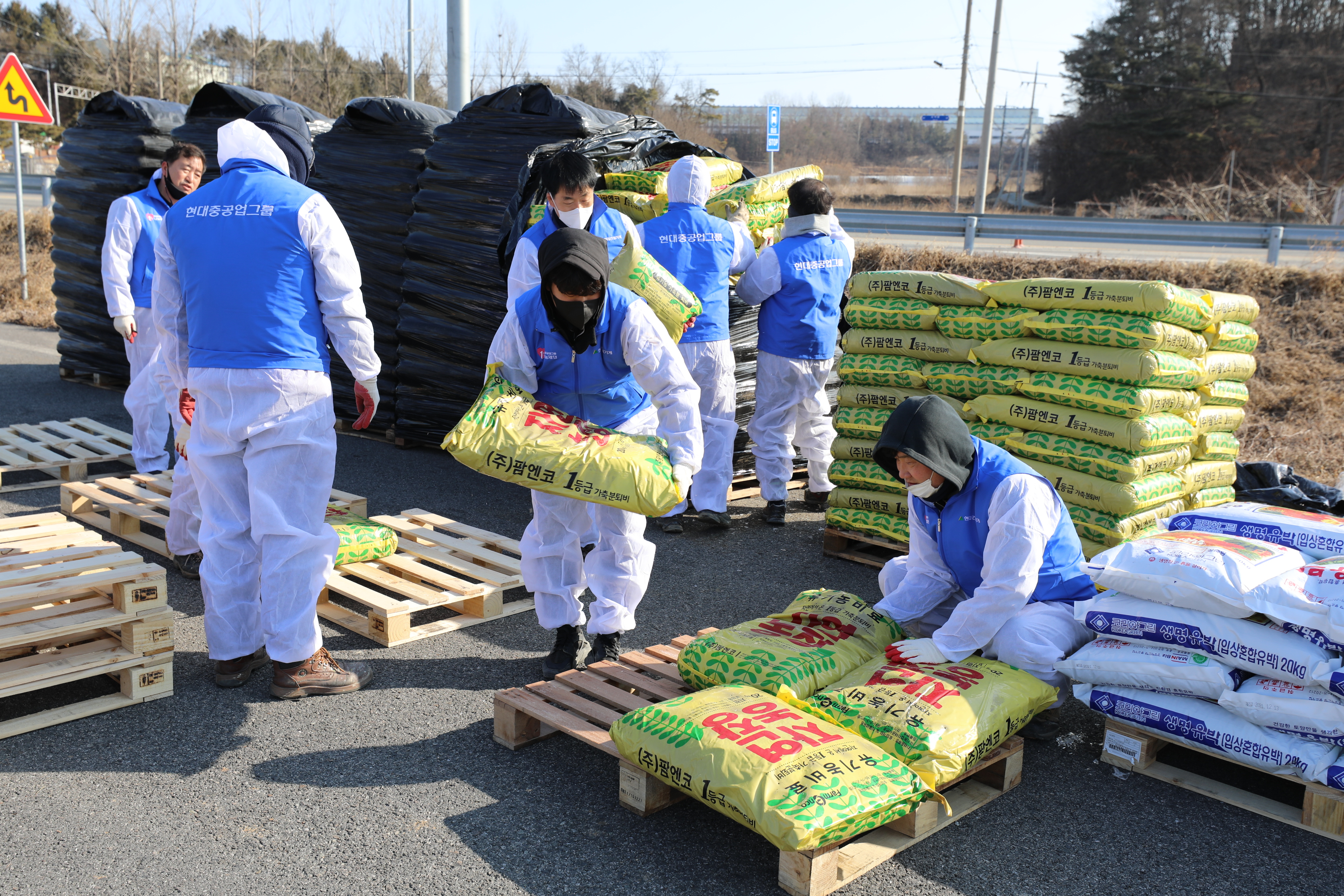 현대건설기계 음성공장 직원 12명은 가축 퇴비 750, 비료 유박 70포를 소이면 대장리 한들마을 23가구에 전달했다.