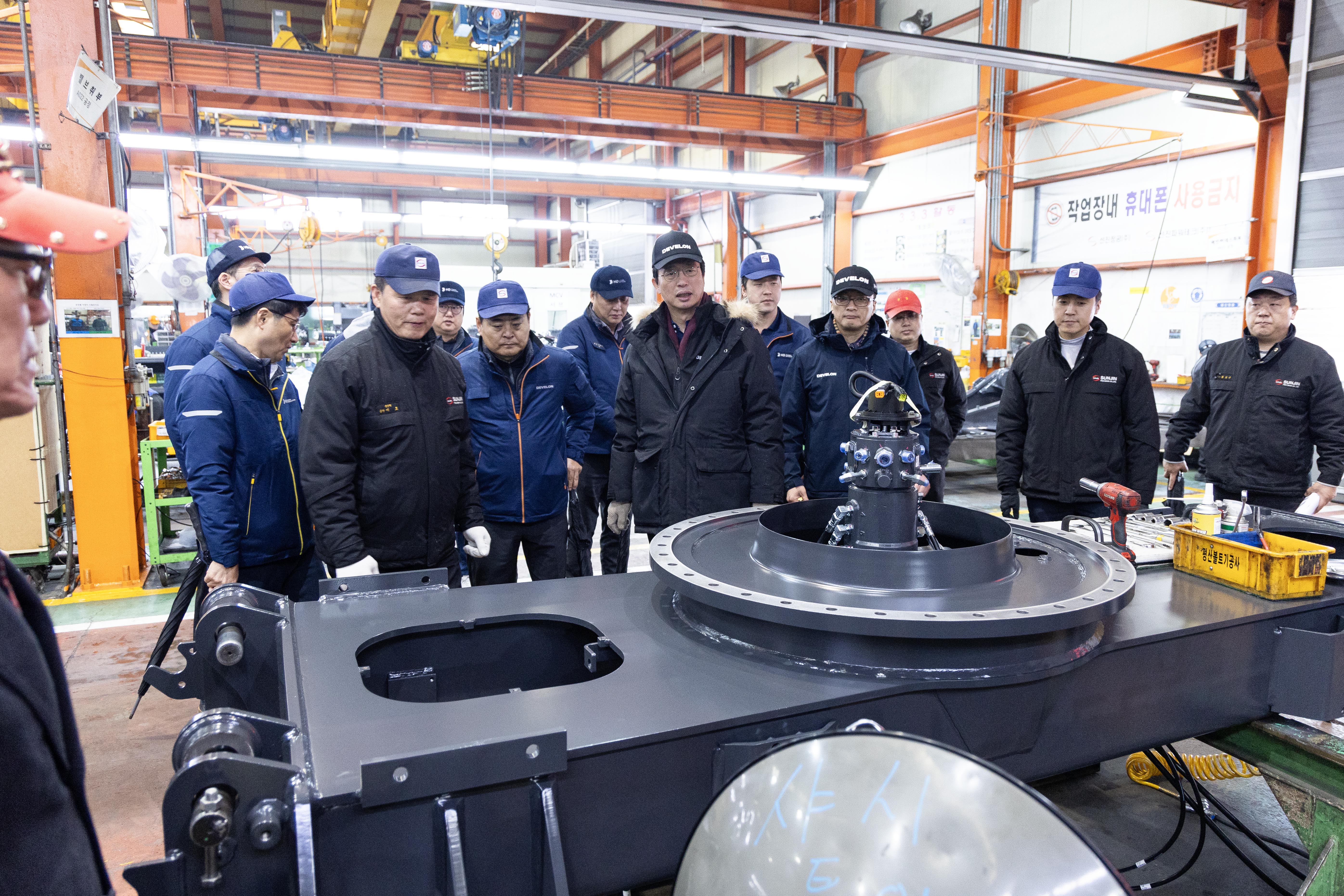 HD현대인프라코어 문재영 부사장(건설기계사업본부)과 생산, 영업, 품질, R&D 임직원들이 지난 2월 12일 디벨론 휠굴착기와 휠로더를 OEM 생산하는 협력사인 선진정공의 천안공장에 방문했다. 문 부사장은 최근 국내에 신규 출시한 핵심 전략 제품 DX150W-7K 생산 현장을 둘러보며 초기품질과 안전의 중요성을 강조하고 애로사항을 청취했다.