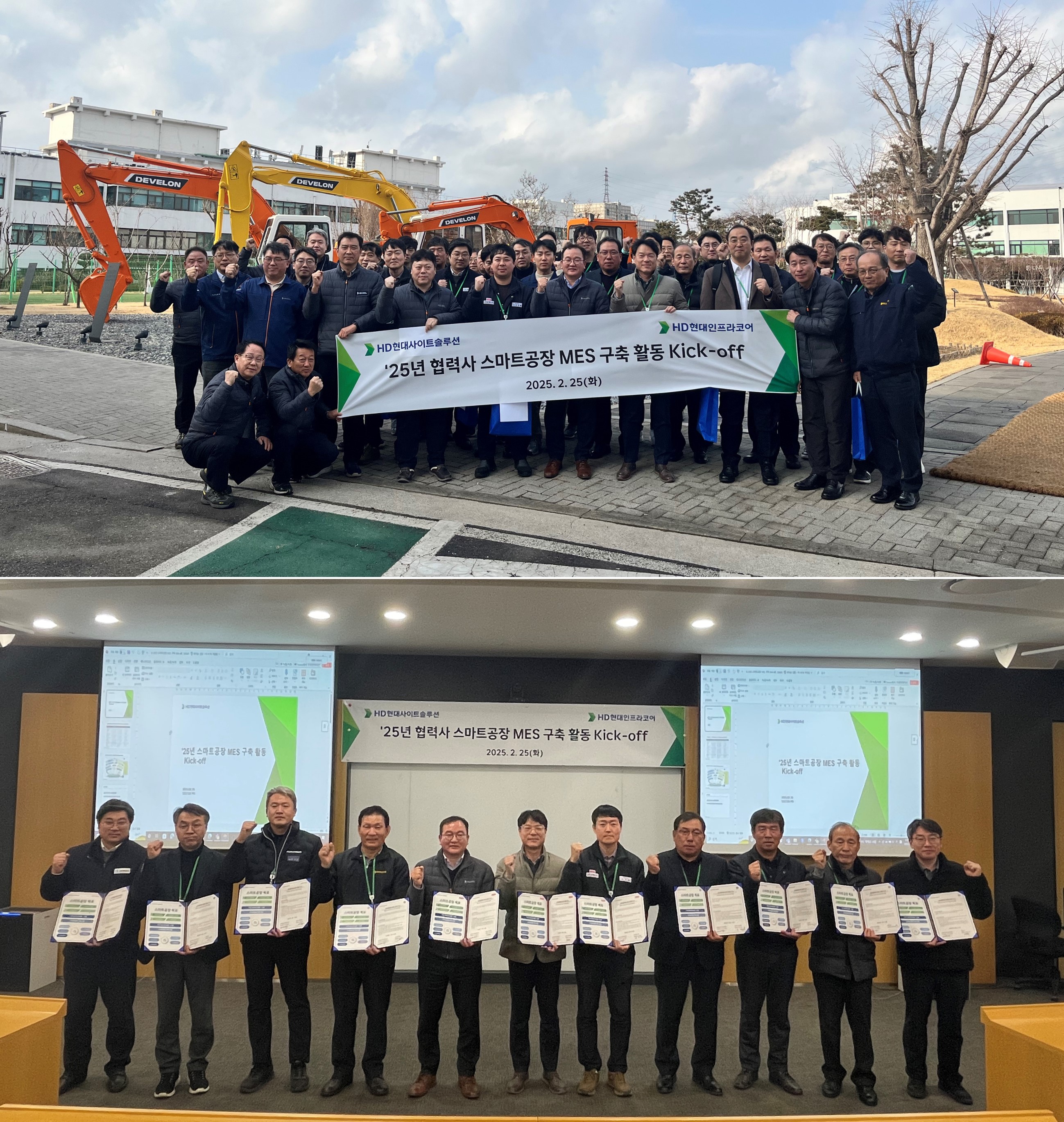 HD현대사이트솔루션과 HD현대인프라코어가 지난 2월 25일 인천공장에서 ‘2025년 협력사 스마트공장 MES (Manufacturing Execution System: 생산운영시스템) 구축 킥오프’ 행사를 개최해 김광보 상무(구매2)와 구매 리더, 협력사 대표이사 등 50명이 참석했다. 이번 킥오프 행사에서는 올해 지원 대상으로 선정된 10개 협력사와 MOU 협약 체결 및 중점 추진 과제에 대한 계획을 공유하고 목표 달성을 다짐했다.