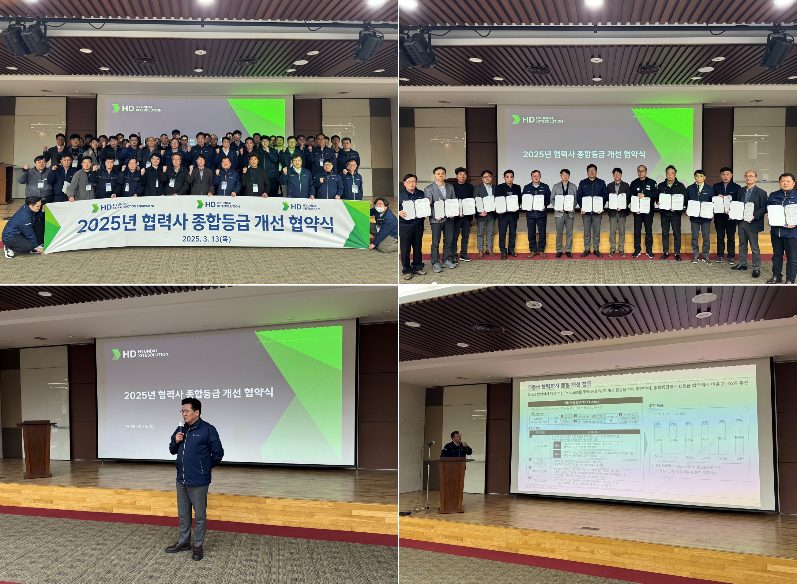 HD현대 건설기계 3사가 지난 3월 13일 ‘2025년 협력사 종합등급 개선 협약식’을 열고 협력사 역량 및 종합등급 향상을 지원하기로 했다. 이날 협약식에는 양경신 전무(통합구매부문) 정창화 상무(구매1), 김광보 상무(구매2), 임창현 상무 (글로벌품질전략)를 비롯해 구매 및 품질 담당자, 협력사 대표 및 임직원 등 총 54명이 참석했으며, 2024년 협력사 종합등급평가 실적과 2025년 운영 방안 공유에 이어 협력사의 종합등급 개선 계획에 대한 발표가 진행됐다.